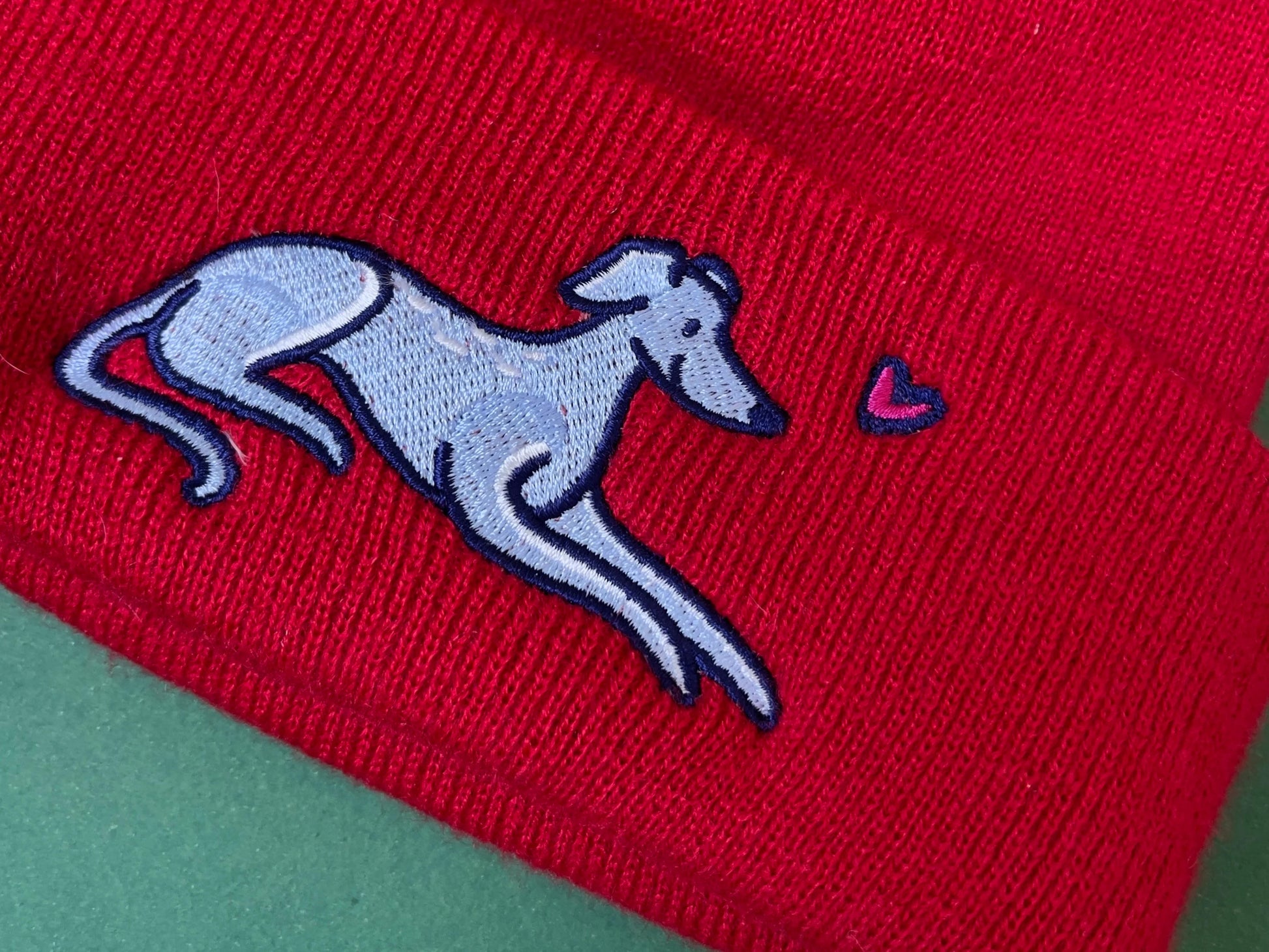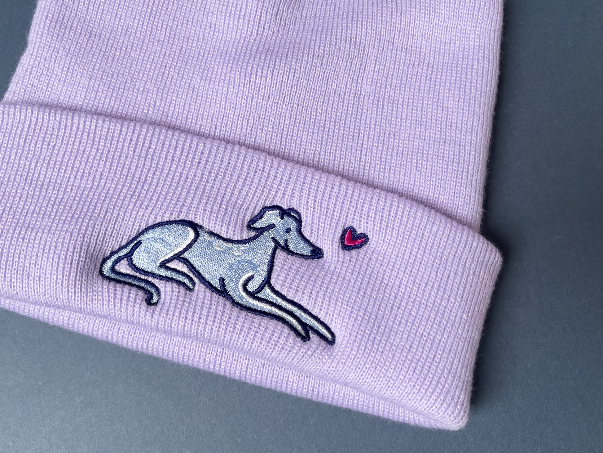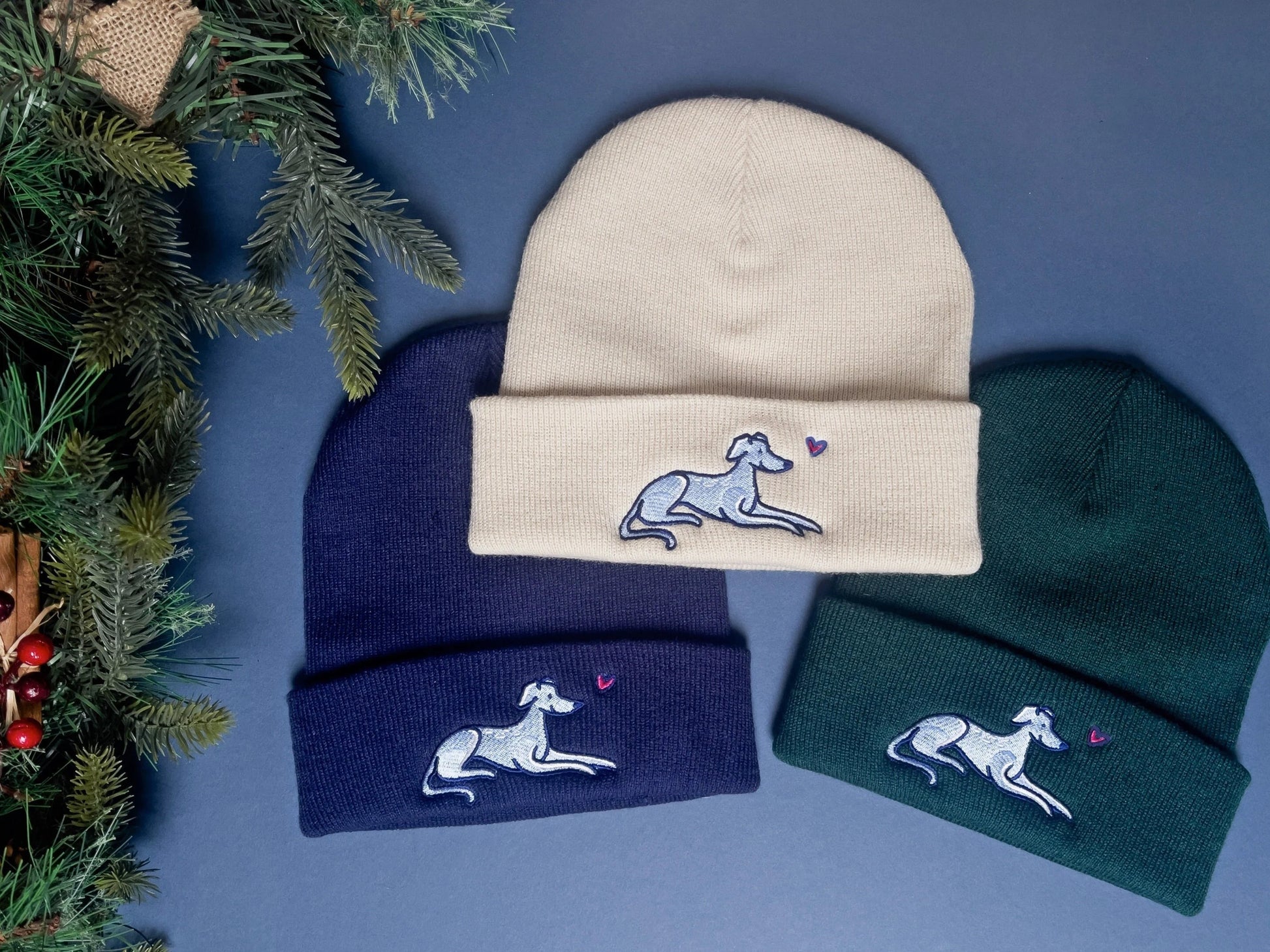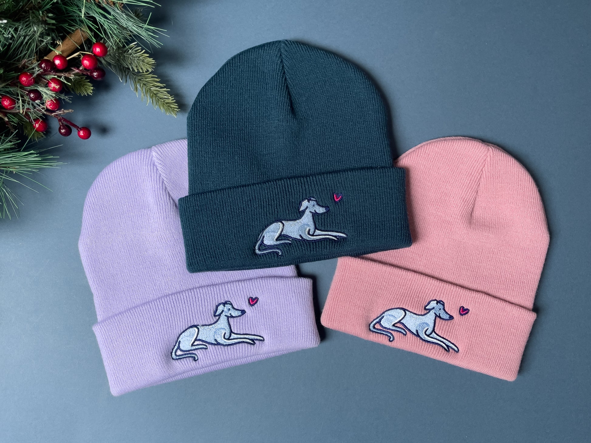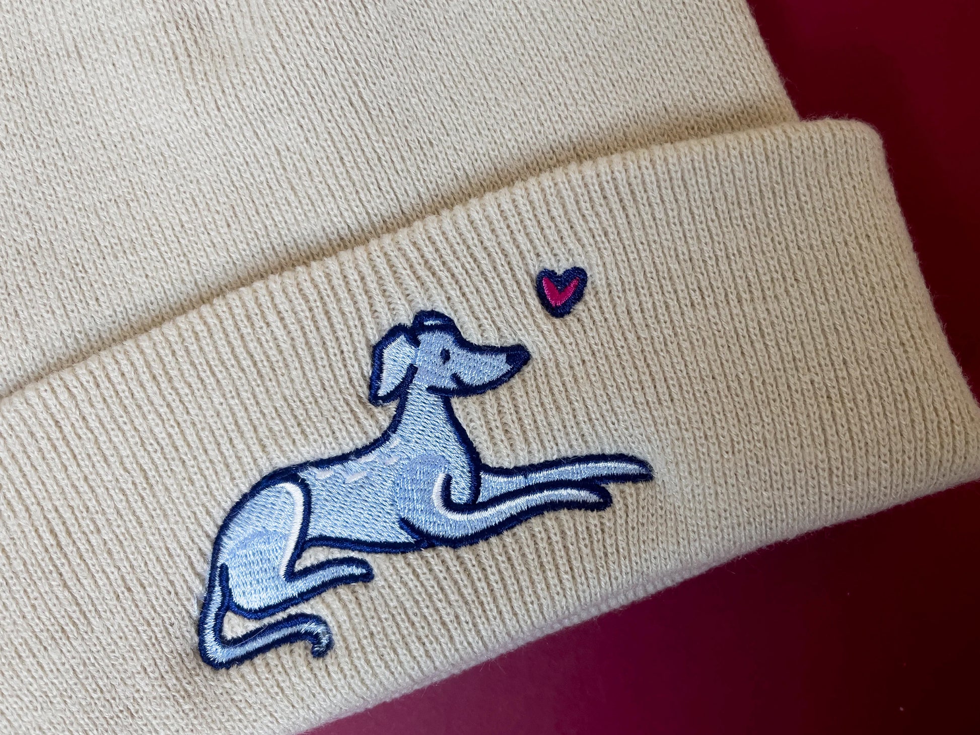 Winter weather calls for a cosy beanie, and what could be better than a beanie with an embroidered sighthound on it! These super soft embroidered beanies feature a sweet sighthound laying down with a little heart above his head. The dog's body is a pale blue with white details.