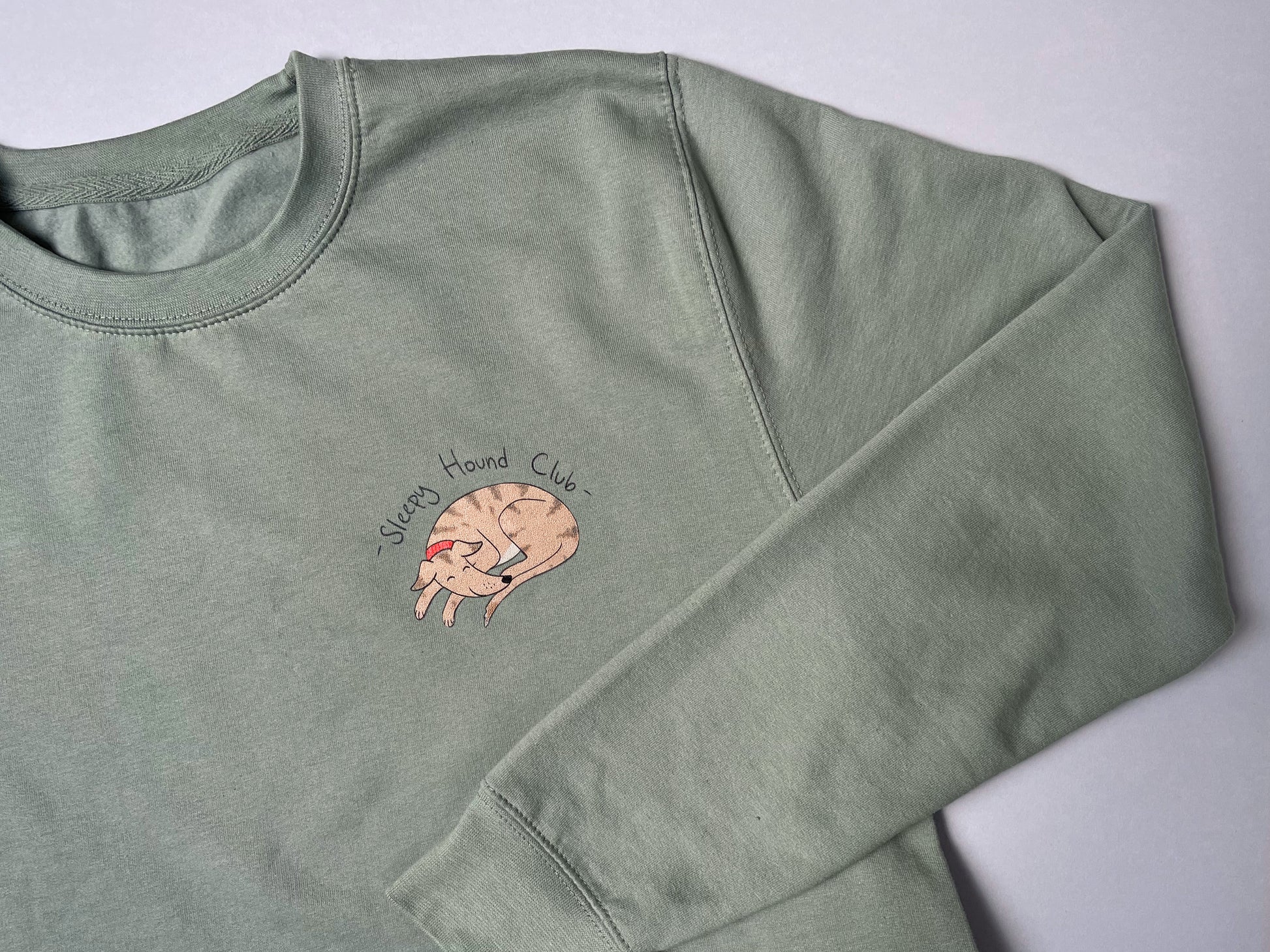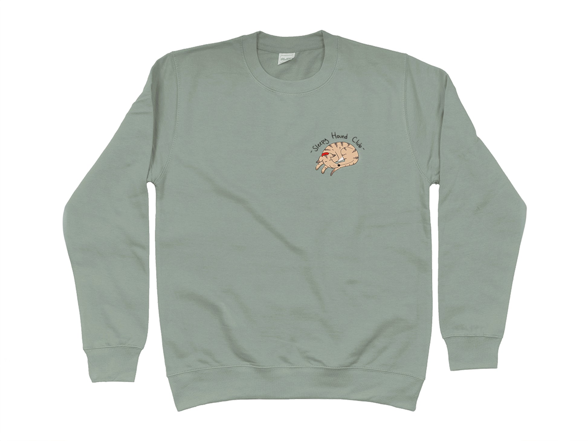 Want a tiny version of a brindle sighthound on your sweatshirt? This cotton-blend top features a little sighthound curled up on the left chest with the text 'Sleepy Hound Club' above.