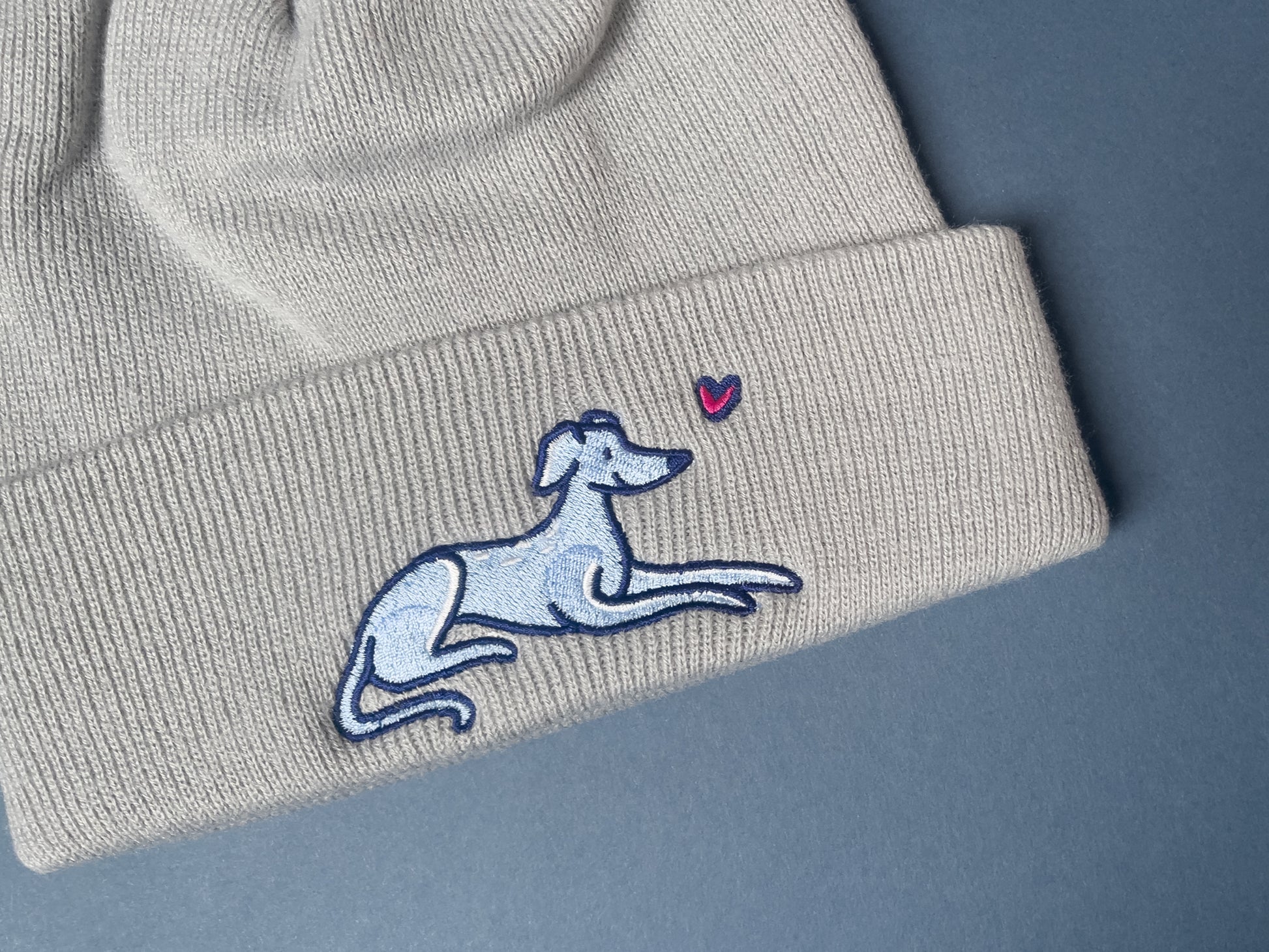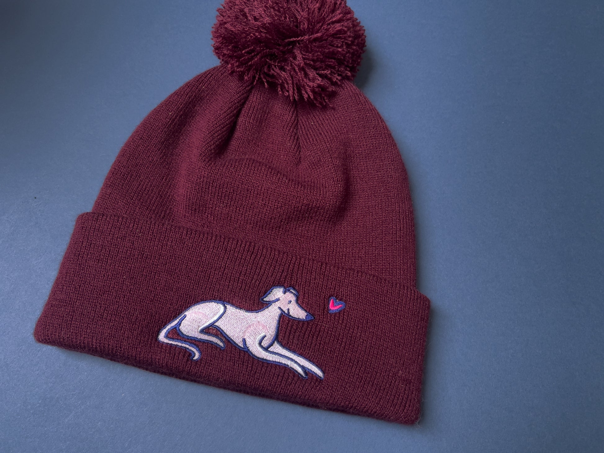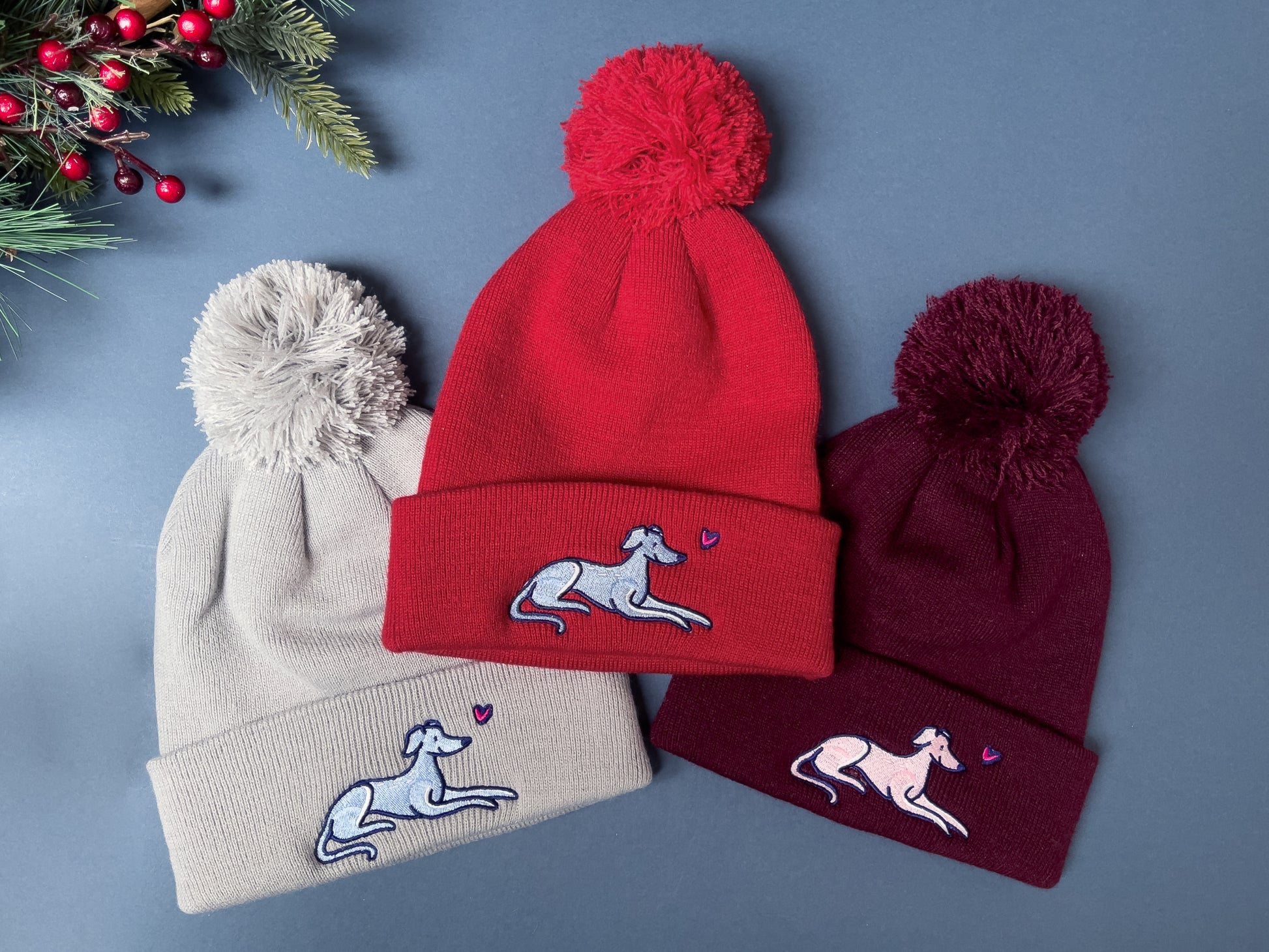 Winter weather calls for a cosy hat, and what could be better than a bobble hat with an embroidered sighthound on it!