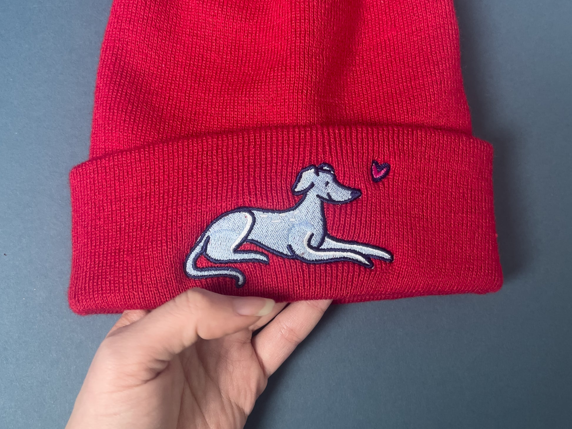 These super soft embroidered beanies feature a sweet sighthound laying down with a little heart above his head. The burgundy hat features a pale pink dog. The grey and red hats have a pale blue dog.