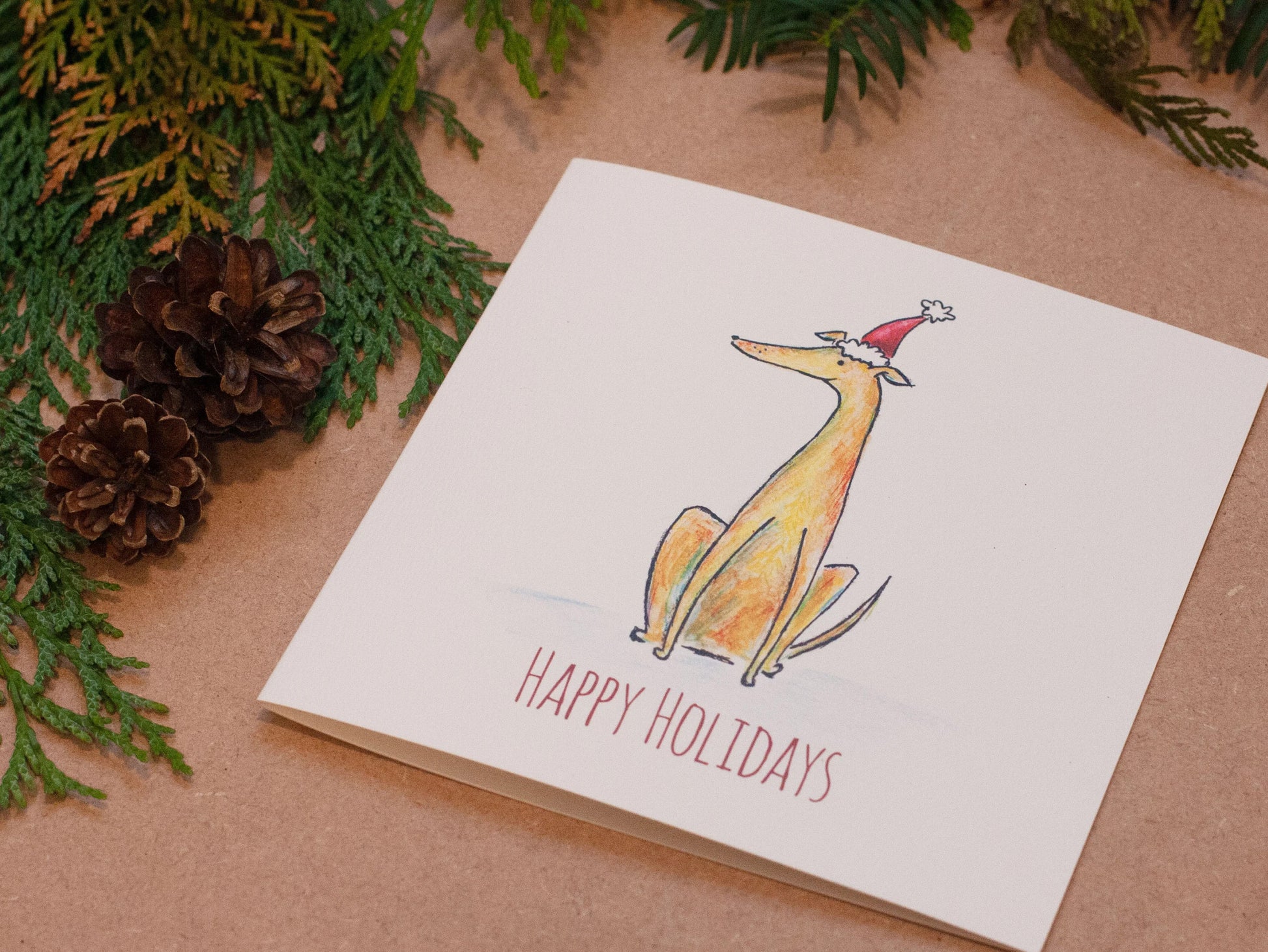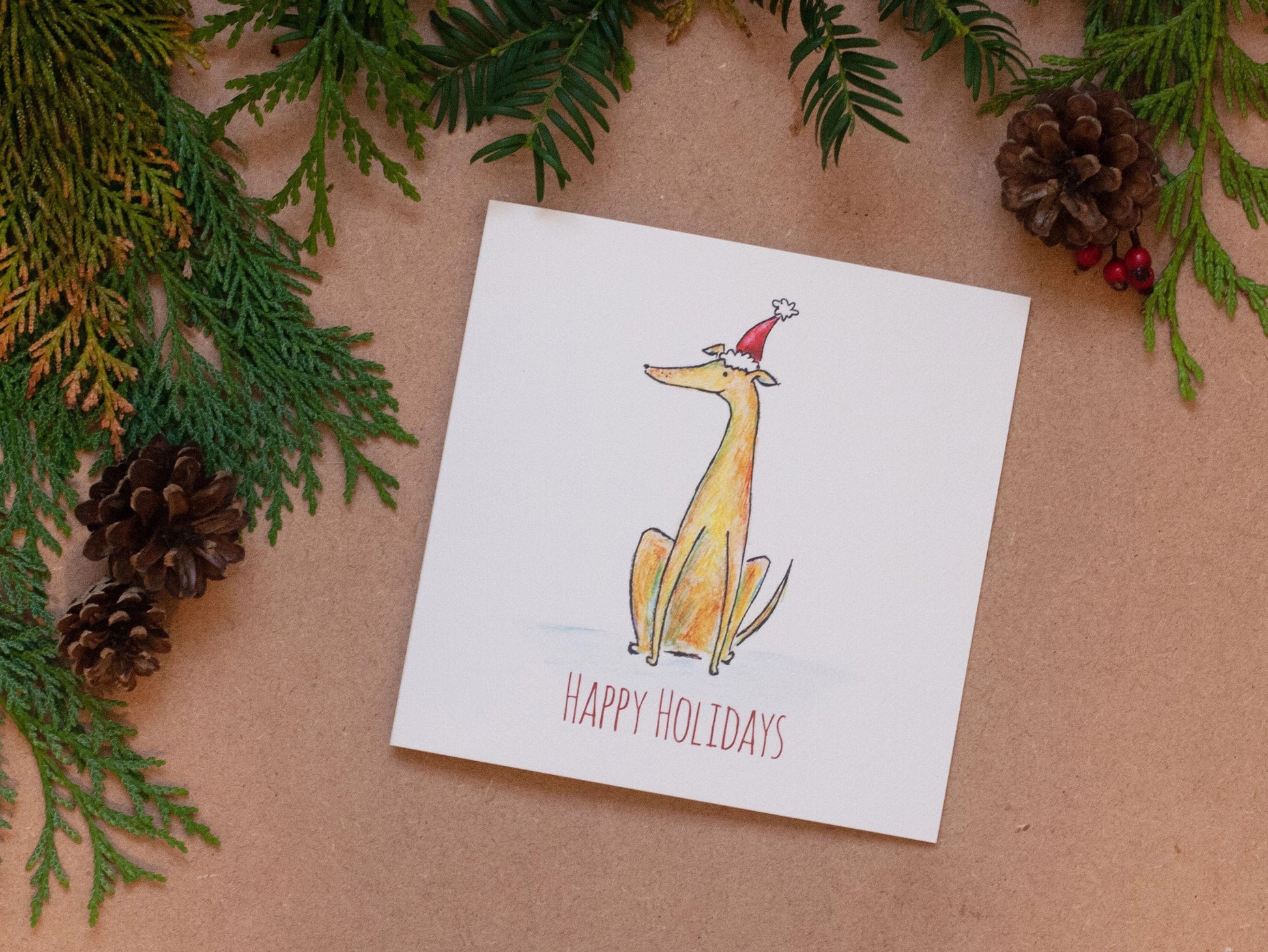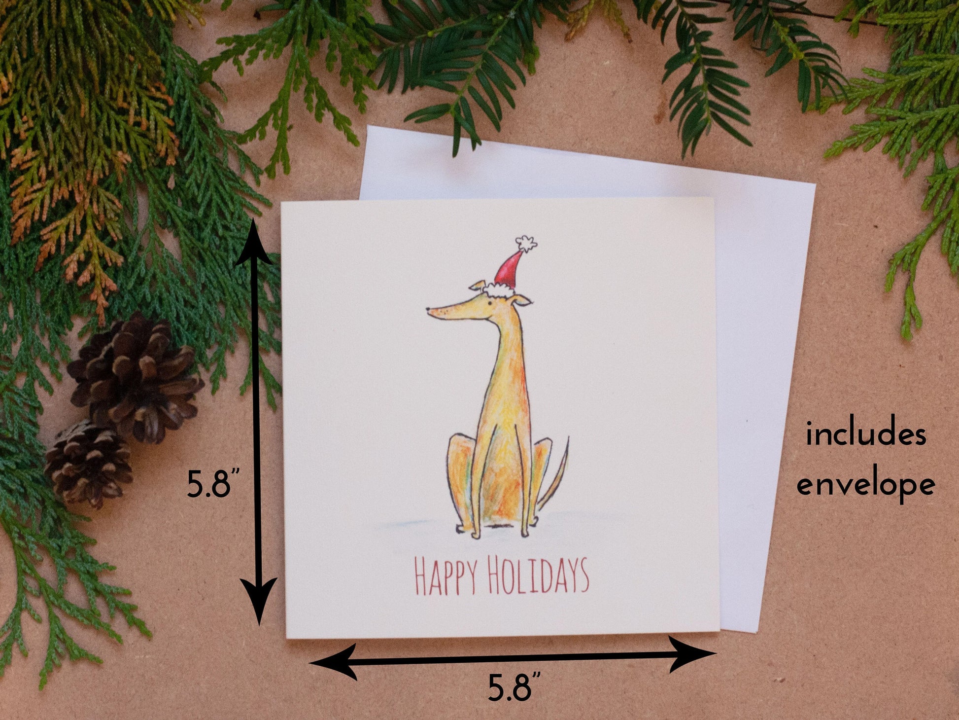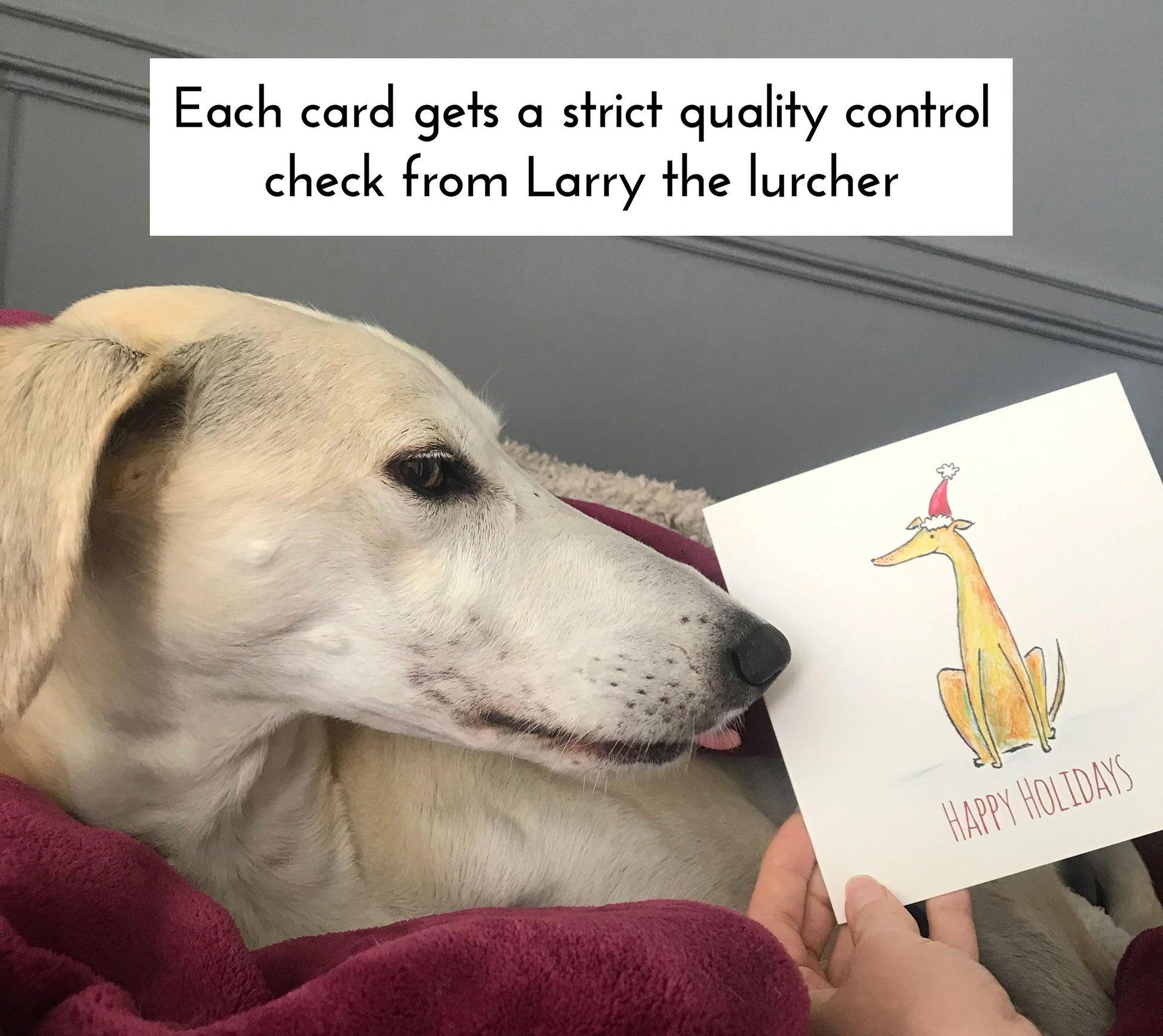 Based on my own lurcher, Larry, this holiday card features a cheerful fawn sighthound in a Santa hat. Perfect for whippet and greyhound owners, this card is sure to put a smile on any dog-lovers face!