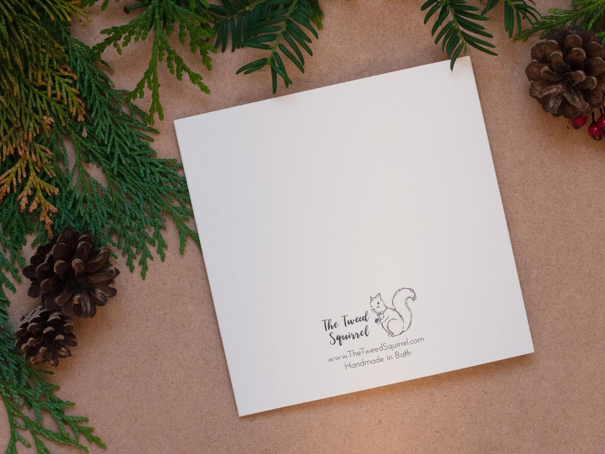 The card size is 5.8" x 5.8." It includes a white envelope. It is posted free of charge via second class post in the UK.