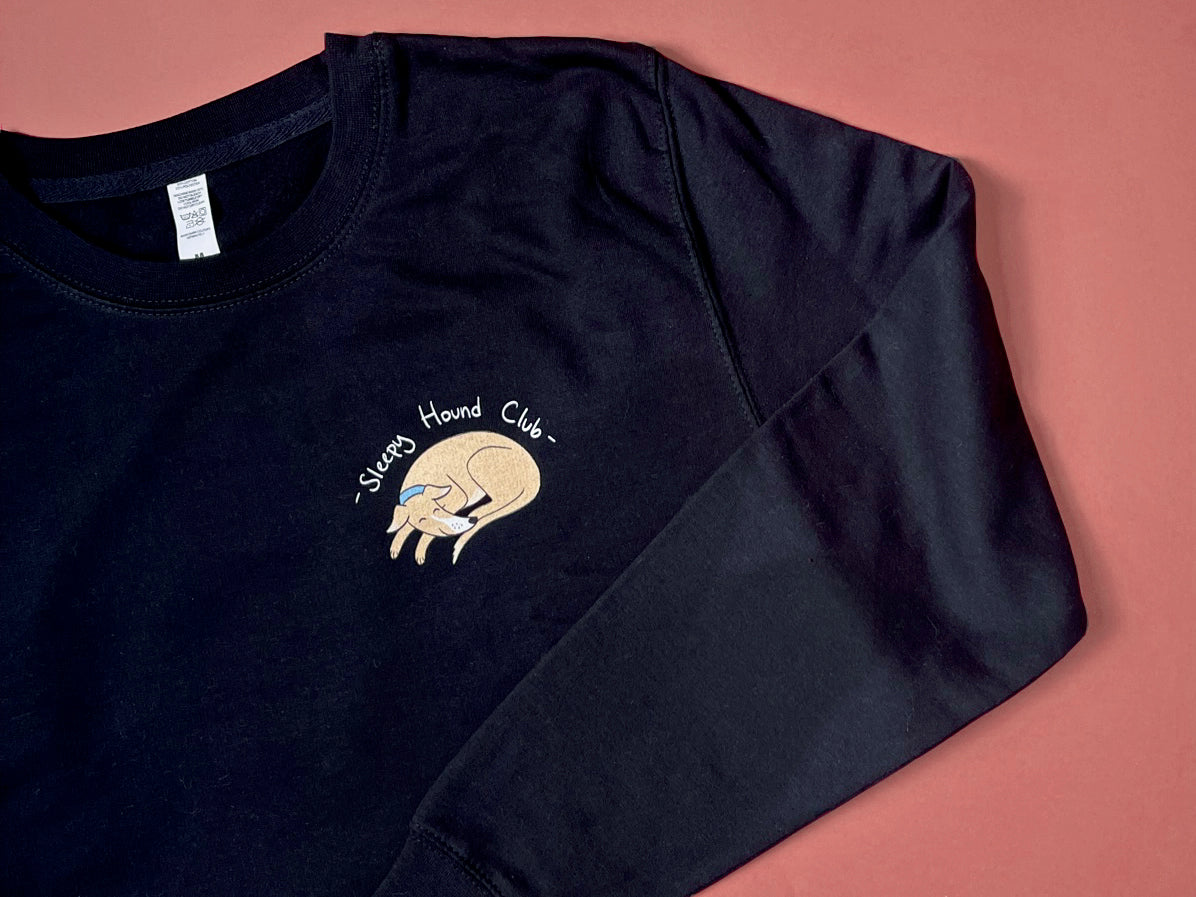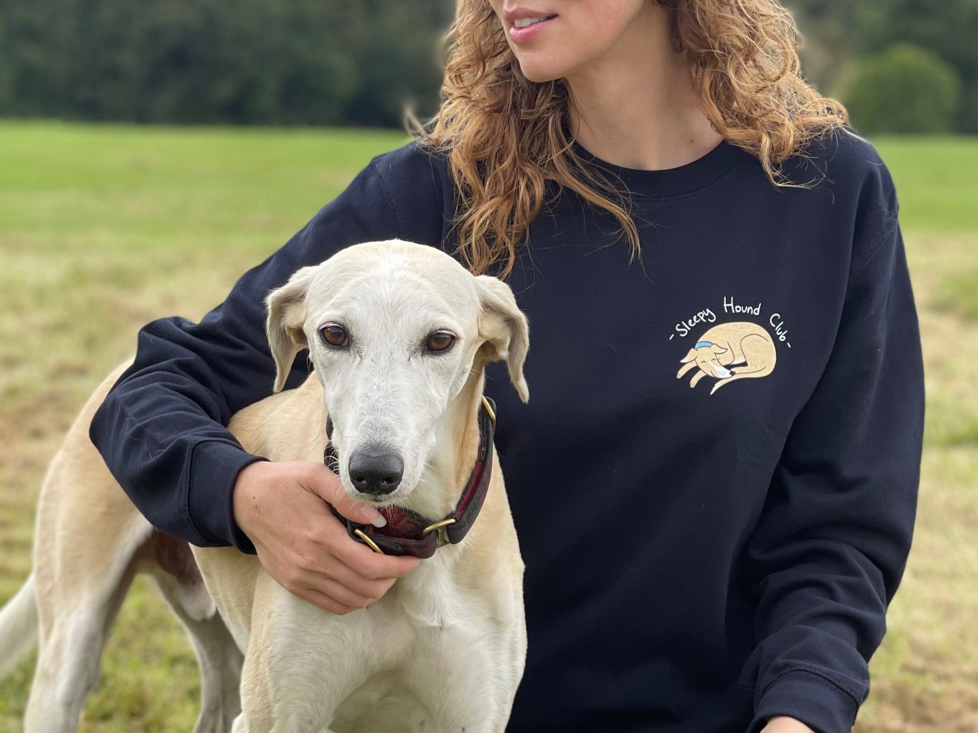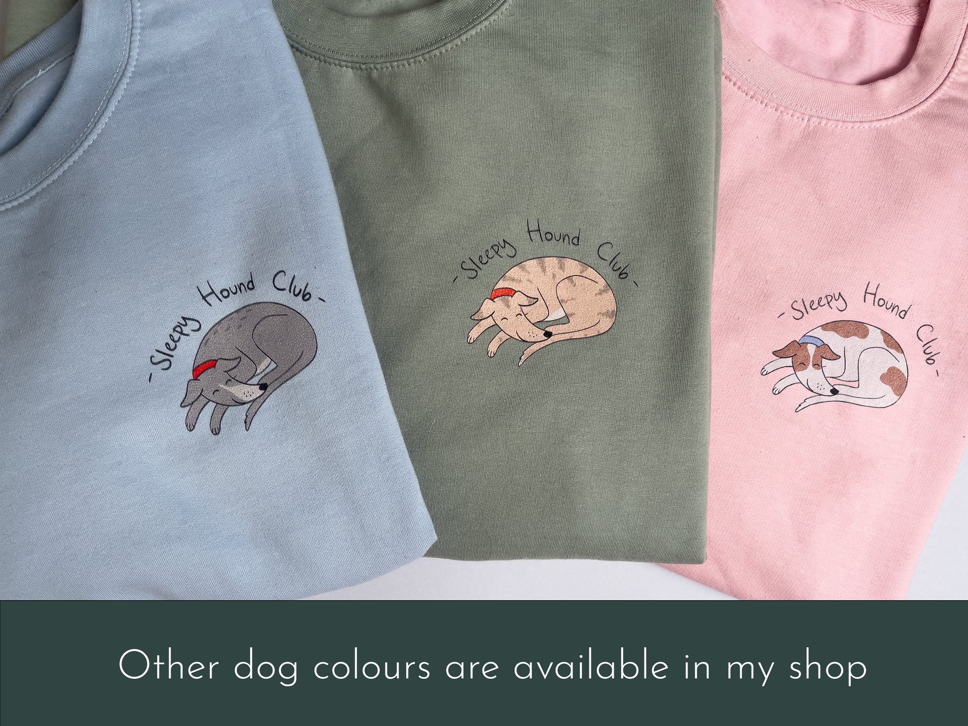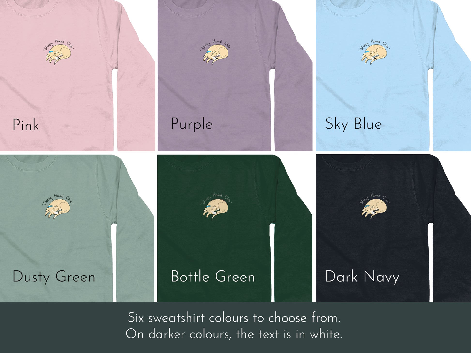 Want a tiny version of a fawn coloured hound on your sweatshirt? This cotton-blend top features a sweet sighthound curled up on the left chest with the text 'Sleepy Hound Club' above. The design is printed on a super-soft sweatshirt, making it perfect for greyhound, whippet, lurcher and galgo lovers!
