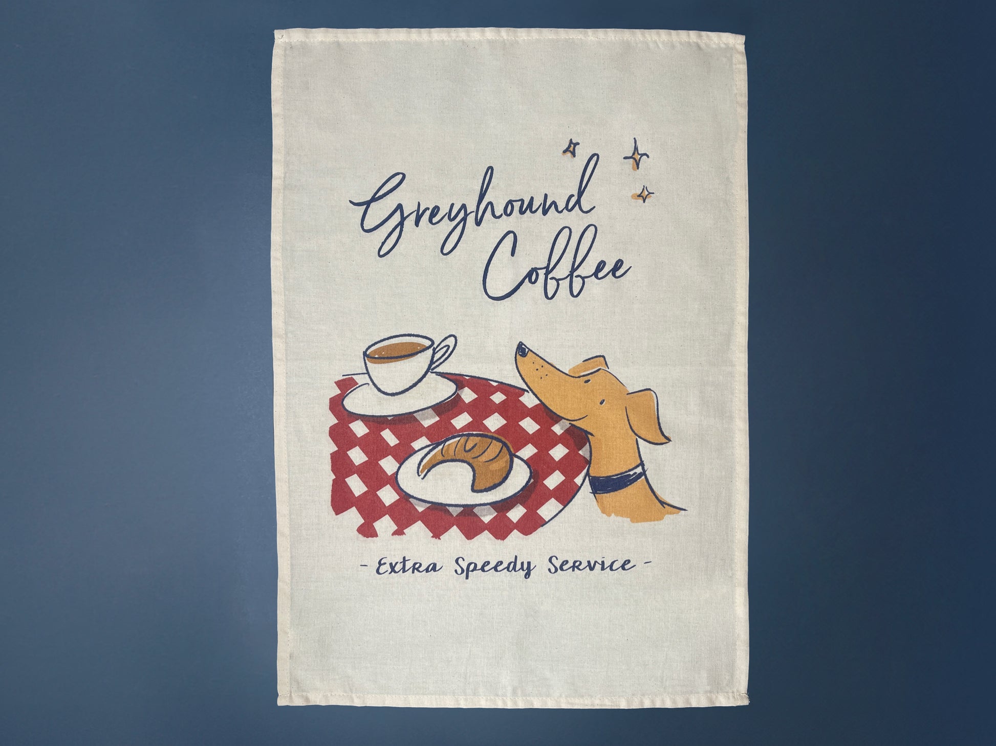 This dish towel features a sweet greyhound at a cafe delivering a coffee and croissant, with the classic sighthound "Extra Speedy Service!" Featuring my own illustration printed on a soft beige cotton, it's a lovely lightweight tea towel that's great for drying dishes or wet hands.