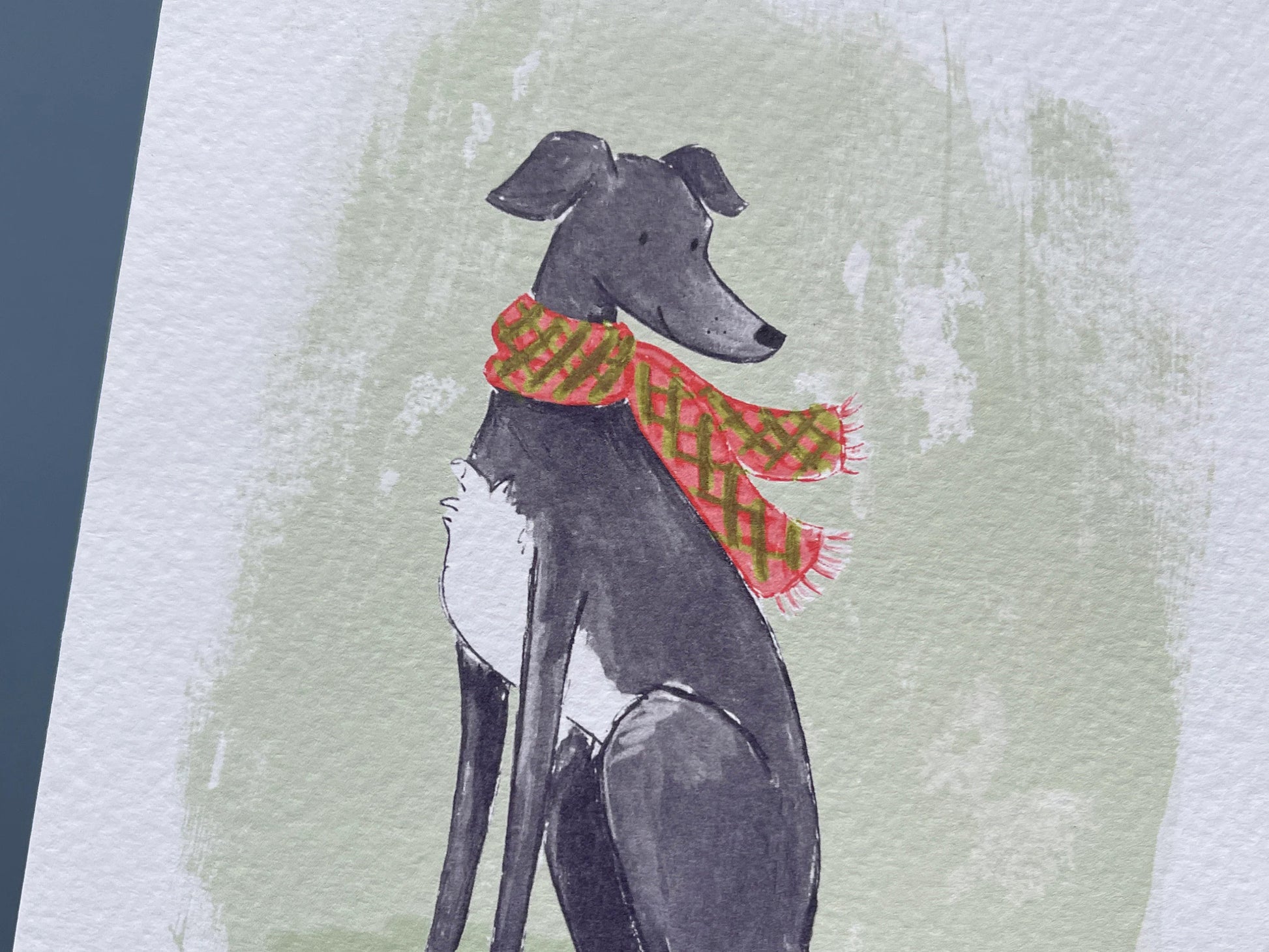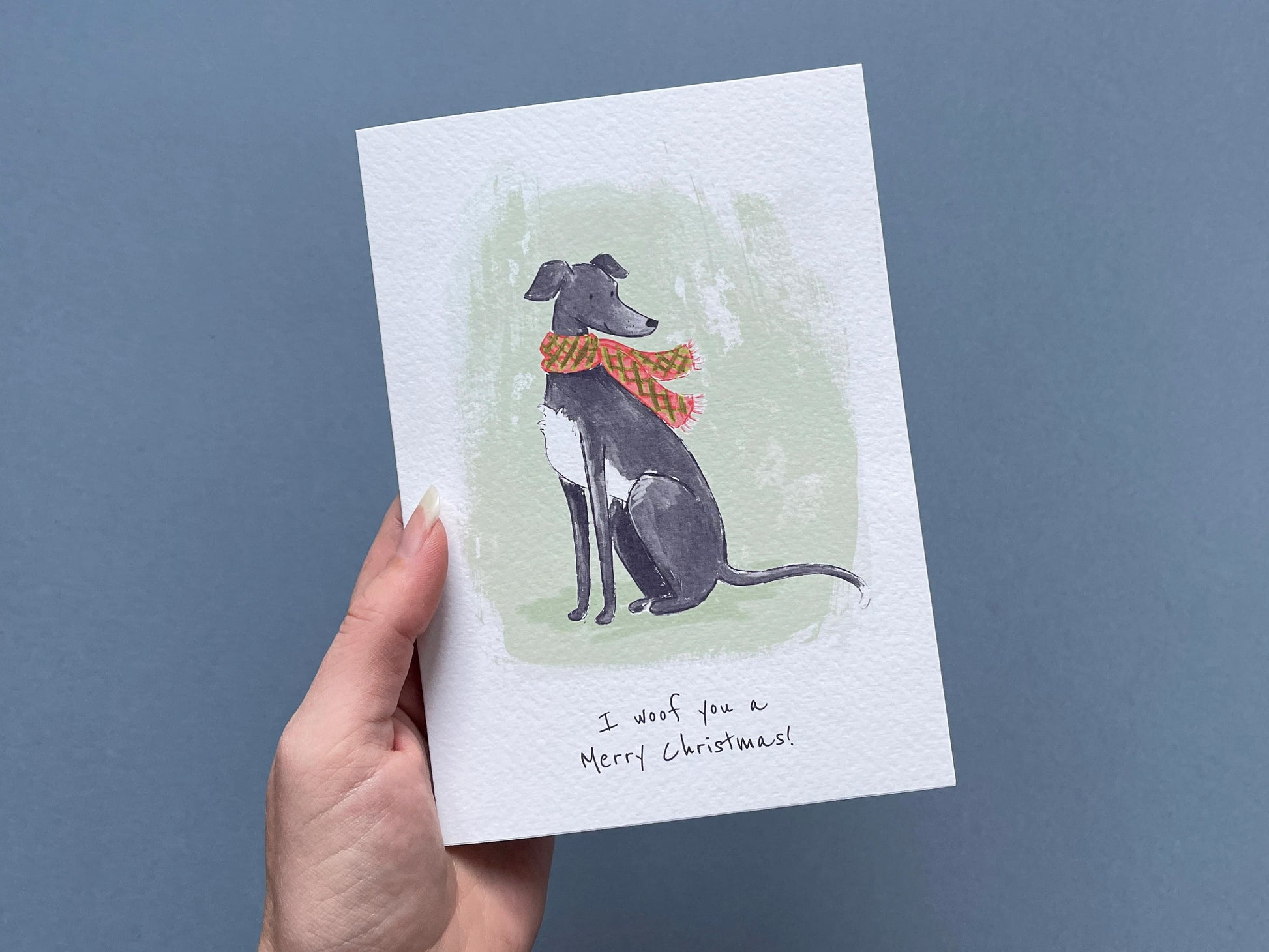 Share your love for sighthounds in your holiday cards! This listing is for a pack of 4 cards. These cards depict a sweet grey sighthound in a tartan scarf, 'woofing' you a Merry Christmas!