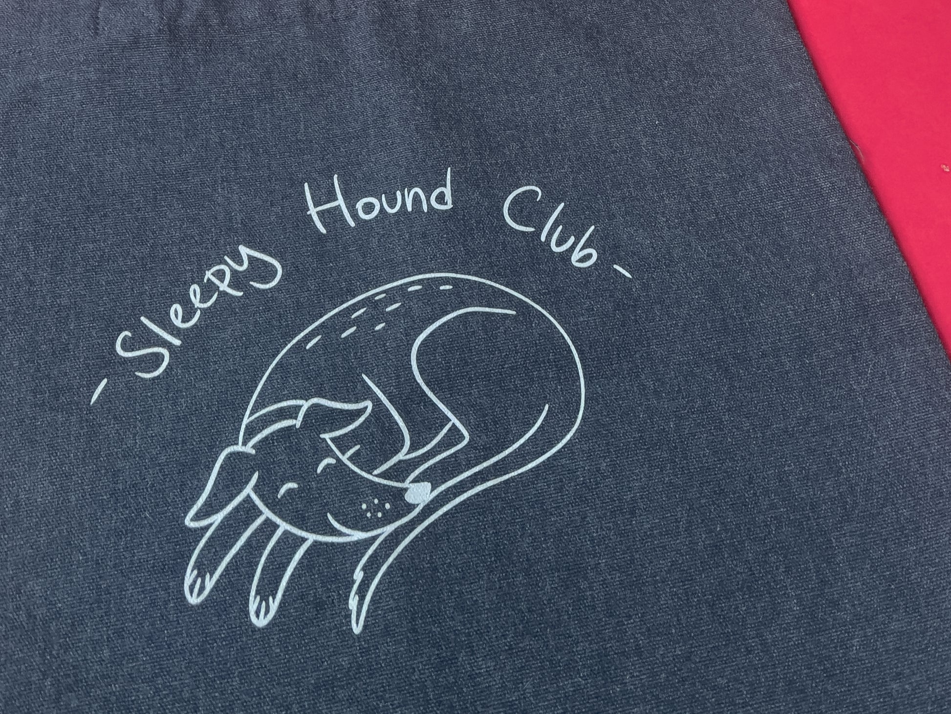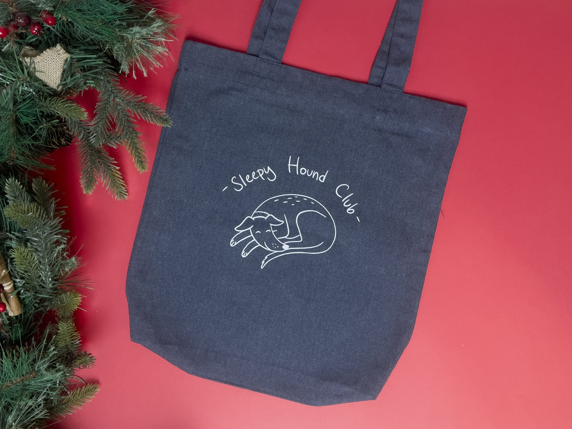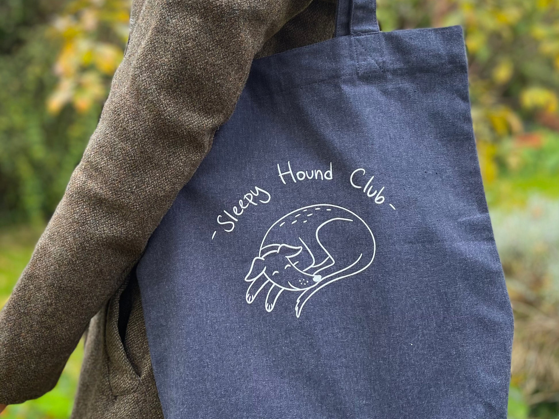 This heavy-weight navy tote bag features a sleepy hound outline with the words 'Sleepy Hound Club'! It's the perfect everyday bag for showcasing your love of sighthounds (and naps!).