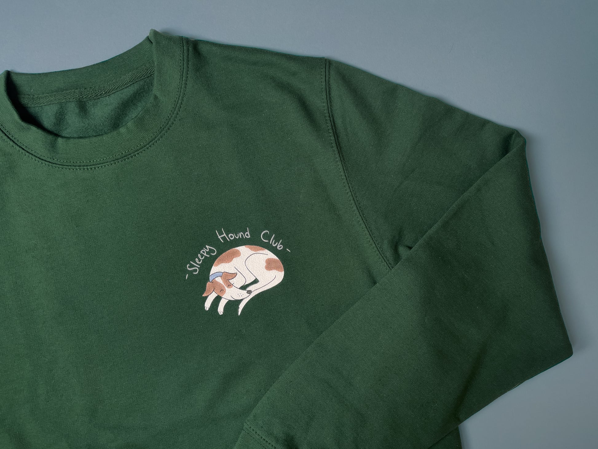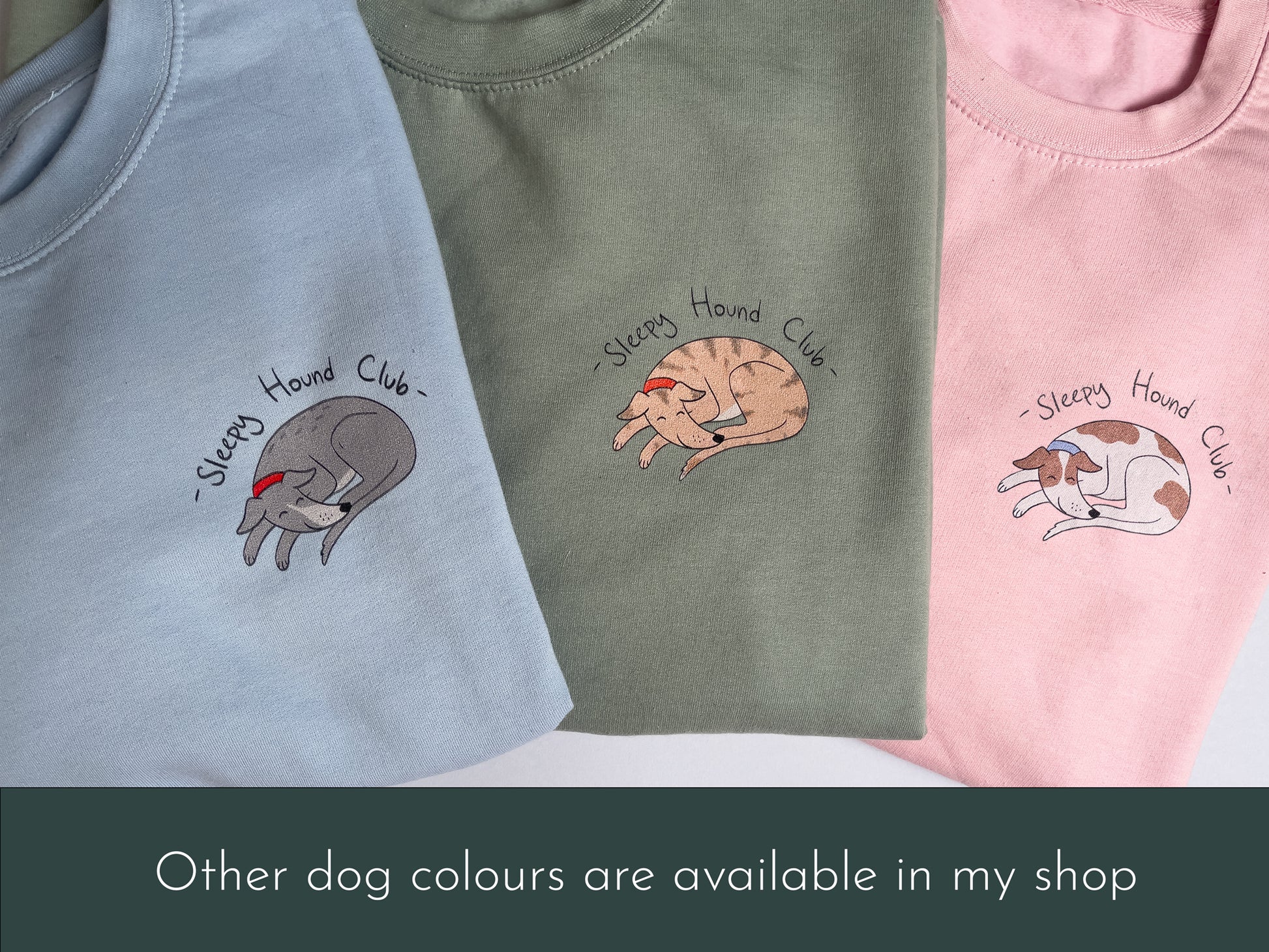 Want a tiny version of a spotted brown and white hound on your sweatshirt? This cotton-blend top features a sweet sighthound curled up on the left chest with the text 'Sleepy Hound Club' above. The design is printed on a super-soft sweatshirt, making it perfect for greyhound, whippet, lurcher and galgo lovers!